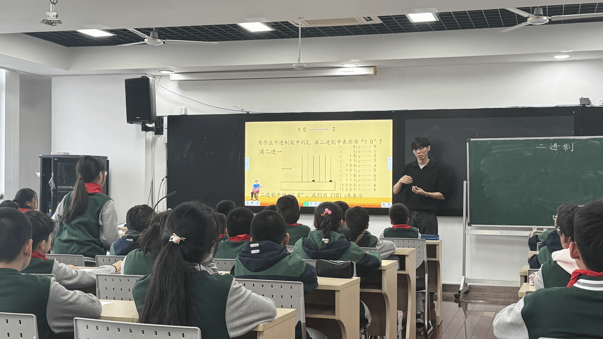 本次赛课中,多位青年教师展示了不同主题的教学实践。在《二进制的秘密》这一富有挑战性与前沿性的课题上,现执教四年级数学的费斌老师,他的教学设计十分亮眼。他摒弃了传统的讲授式教学,精心组织学生进行“编码”与“解码”的实践操作活动。课堂上,学生在他引导下动手体验,将抽象的数字转化为具体的操作,在亲身的编码实践中感悟二进制“逢二进一”的简洁逻辑,在合作解码的过程中理解数位的本质意义。这种“做中学” 的模式,不仅极大地激发了学生的探究兴趣,更将无形的数学思维化为有形的实践,有效拓展了学生的数理思维和计算思维,充分体现了新课标所倡导的实践性与综合性学习理念。