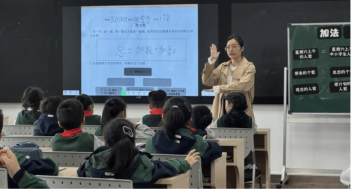 在本次赛课中,孙蓉老师老师围绕《加法数量关系》展开教学,注重引导学生从具体情境中抽象出数学模型。孙老师围绕研学活动中小宇发现的数量关系,启发学生理解“总量=分量+分量”的加法数量关系模型,推动学生实现从感性认识到理性建模的跨越。