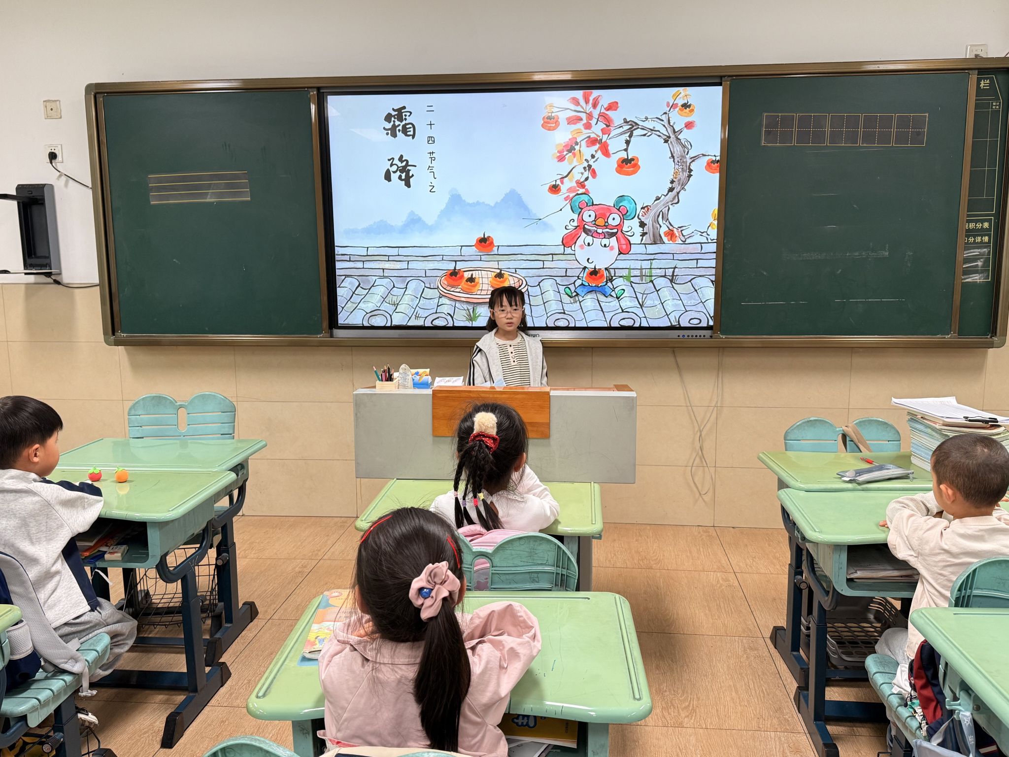 活动伊始,中队辅导员邀请队员们走上讲台,分享自己对霜降的理解。“我觉得霜降就是地上有白白的霜!”“我知道霜降可以吃柿子!”队员们踊跃发言,用稚嫩的语言表达着对霜降的初步认知。随后,辅导员结合队员们的分享,生动讲解了霜降节气的由来、习俗以及相关农事活动。霜降,是二十四节气中的第十八个节气,标志着深秋时节的正式开始。此时,气温骤降,昼夜温差大,水汽凝结成霜,柿子等果实成熟,大地呈现“霜白柿红”的独特景致。队员们听得格外专注,对霜降节气的认识也更加立体。