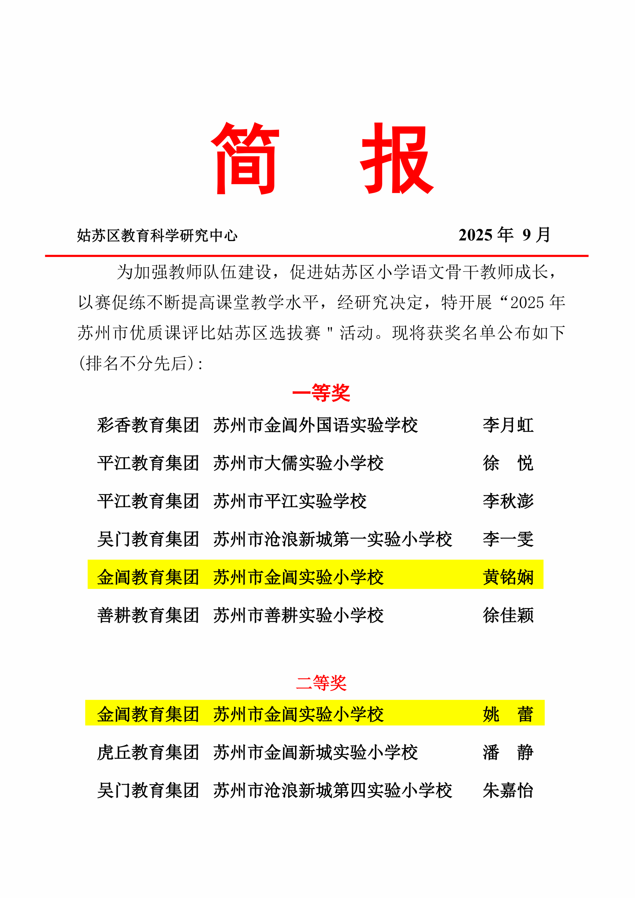 在刚刚结束的2025年苏州市小学语文优质课评比姑苏区选拔赛中,苏州市金阊实验小学校的黄铭娴老师执教的《去外婆家》(二年级)荣获一等奖,姚蕾老师执教的《蟋蟀的住宅》(四年级)荣获二等奖,特向两位老师及语文教研团队表示祝贺!这一成绩充分展现了教师的专业素养和学校教育教学的质量提升。