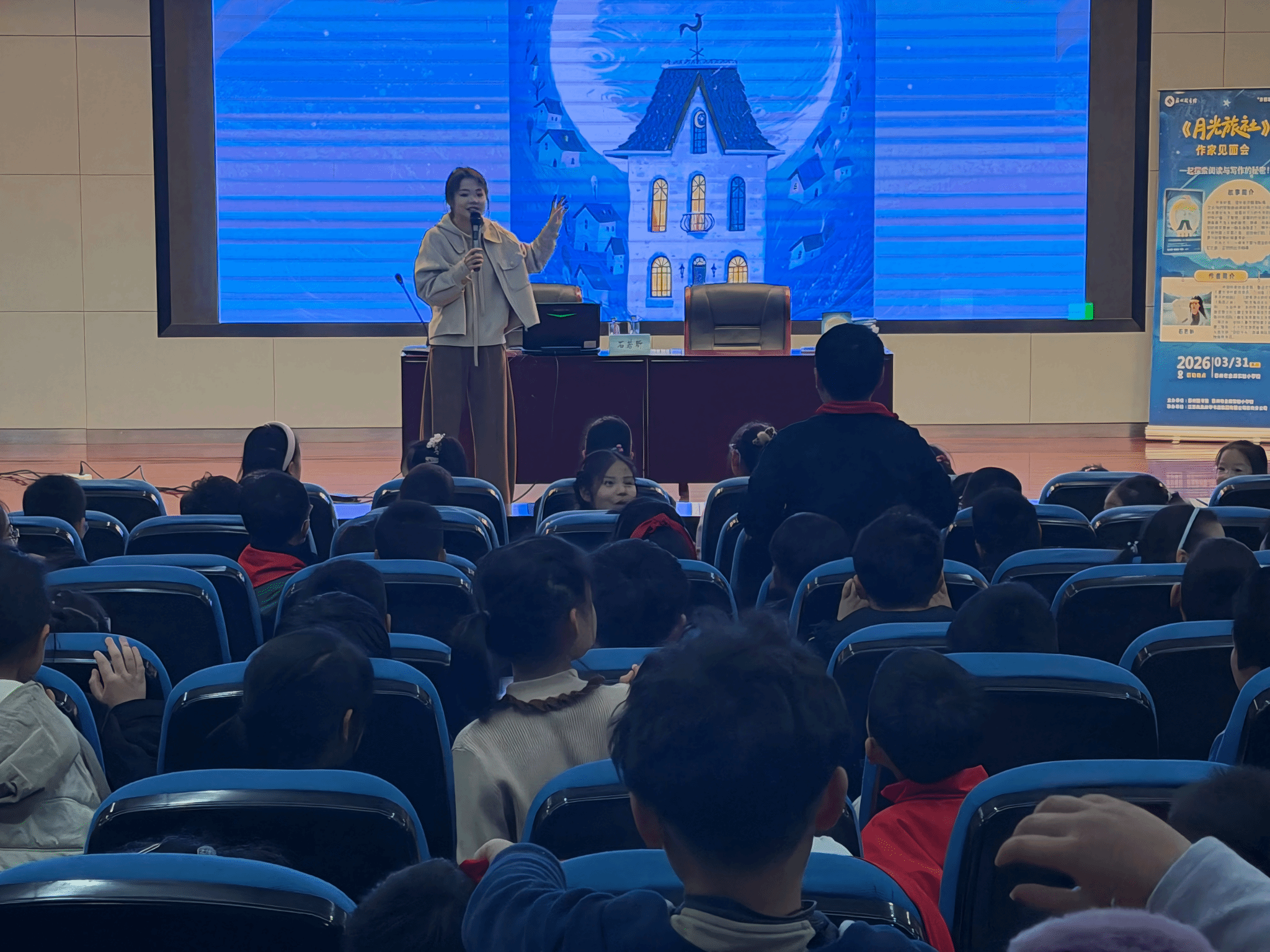 石若昕老师是中国作家协会会员,更是曹文轩儿童文学奖、陈伯吹国际儿童文学奖双料得主,此次她带着新作《月光旅社》来到校园,带领孩子们走进奇幻的文学世界。讲座中,石老师结合自身创作经历,分享了童年阅读故事与写作心得,用生动有趣的语言讲解阅读的乐趣与写作的技巧,还通过赏析书中精美国风插画,引导孩子们放飞想象,锻炼看图写话能力。